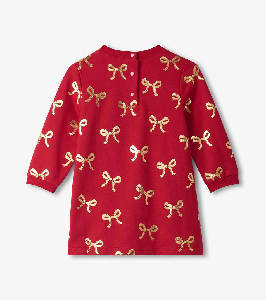 The Baby & Toddler Girls Gold Ribbon Dress is a festive favourite, made from 100% cotton lightweight French terry for softness and comfort. Designed in a cheerful red hue, this long-sleeve dress features a classic round neckline with ribbed trim, ribbed cuffs, and an easy A-line silhouette for playful movement. An all-over metallic gold bow pattern adds sparkle and holiday charm, while small button snaps at the back ensure quick and easy dressing.
