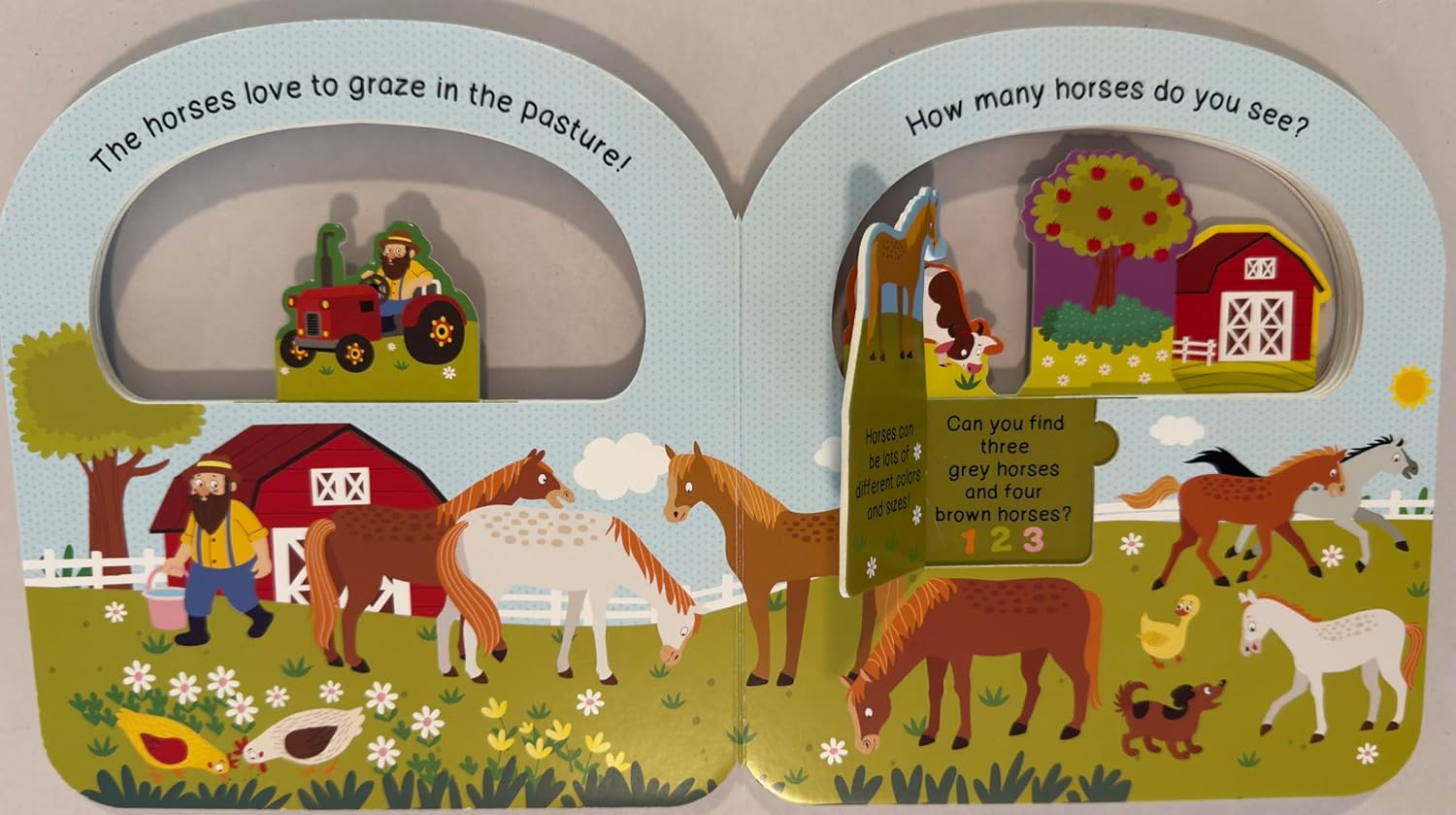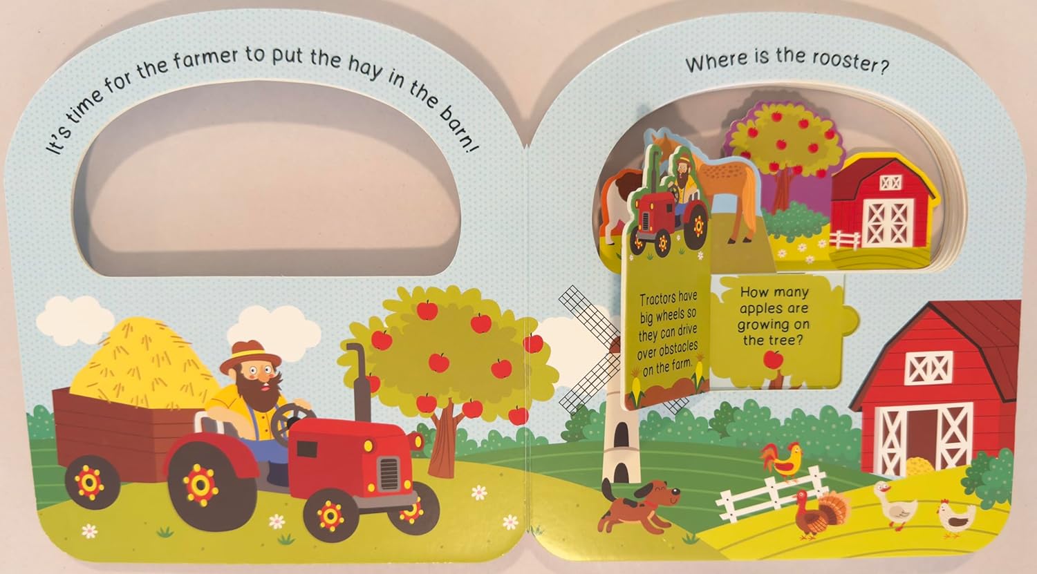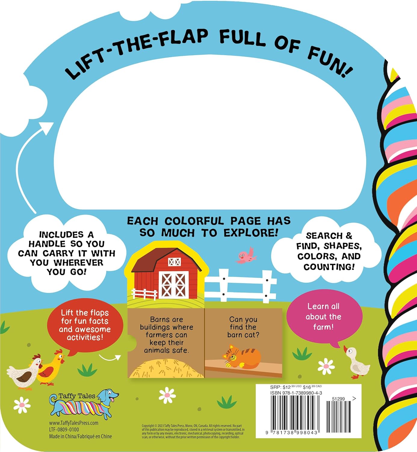 Take a delightful trip to the farm with On the Farm, an engaging farm board book for toddlers and preschoolers. Part of Taffy Tales’ best-selling Look and Find Lift-the-Flap series, this colorful interactive preschool book introduces young readers to farm life with playful animals, tractors, and everyday farm activities. Lift the chunky flaps to uncover hidden surprises, helping children build observation skills while having fun exploring cows, chickens, pigs, and more! Why readers will love this book: Interactive exploration: Lift-the-flap surprises make learning about farm life fun and engaging. Vibrant, child-friendly illustrations: Bright, colorful farm scenes captivate toddlers and preschoolers. Durable and portable: Sturdy board book with a built-in handle is perfect for little hands and reading on the go. About the Look and Find Lift-the-Flap series: Taffy Tales’ Look and Find Lift-the-Flap series features interactive board books for toddlers and preschoolers that spark curiosity, promote early language development, and encourage observation skills. Each title offers fun surprises that children will want to read again and again.