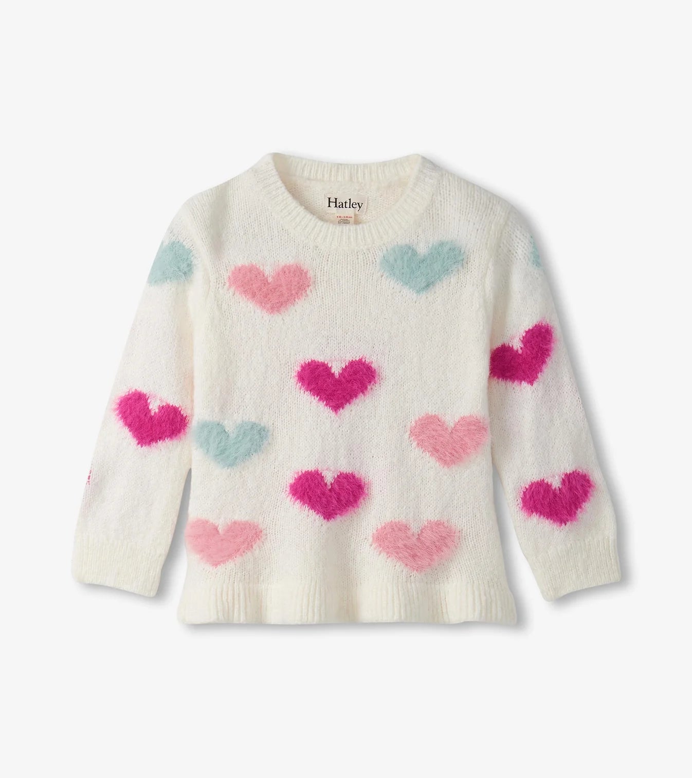 Wrap her in warmth and sweetness with the Baby & Toddler Girls Precious Hearts Pretty Sweater in Natural! This drapey pullover sweater is made from a soft, breathable cotton blend that’s gentle on delicate skin. Designed with a round neckline, long sleeves, cuffed wrists, and a slightly dropped shoulder, it offers both comfort and style. The natural white background is decorated with an all-over pattern of fuzzy pink, baby blue, and fuchsia heart-inspired flowers, while a full cardigan stitch ruffle at the hem adds an extra touch of charm.
