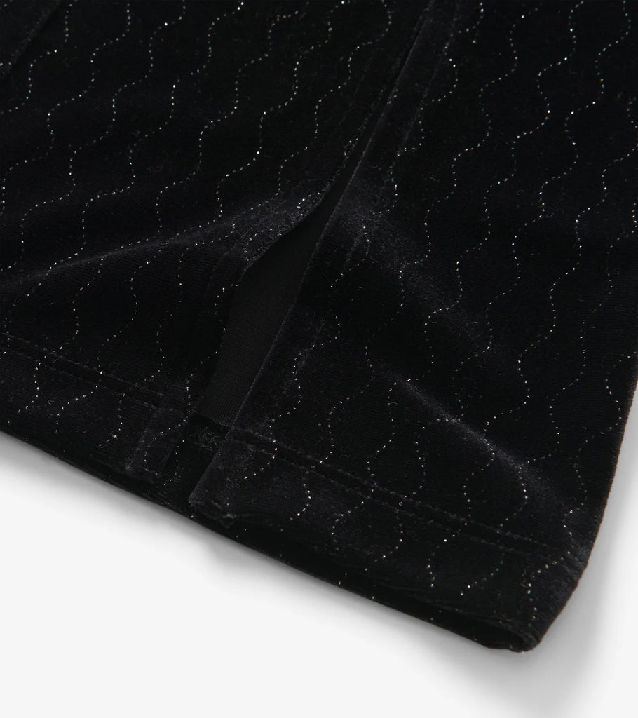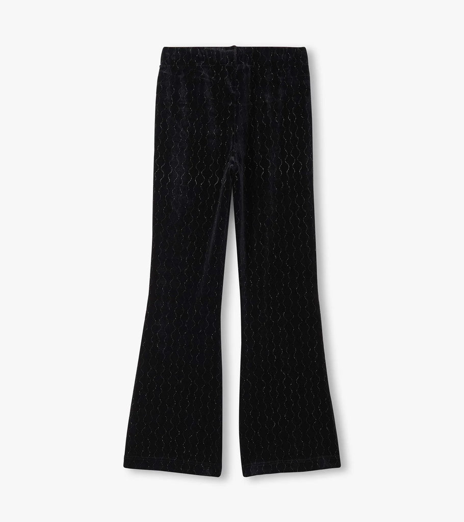 Let her shine with every step in the Girls Black Sparkle Wave Velour Flared Pants, crafted from soft stretch velour for a perfect mix of comfort and glam. They feature a sleek black base accented with subtle wavy lines that shimmer as they catch the light, adding a fun and stylish twist. Designed with an elastic waistband for easy wear and gentle slits at the center front of each leg opening, they offer both comfort and flair.