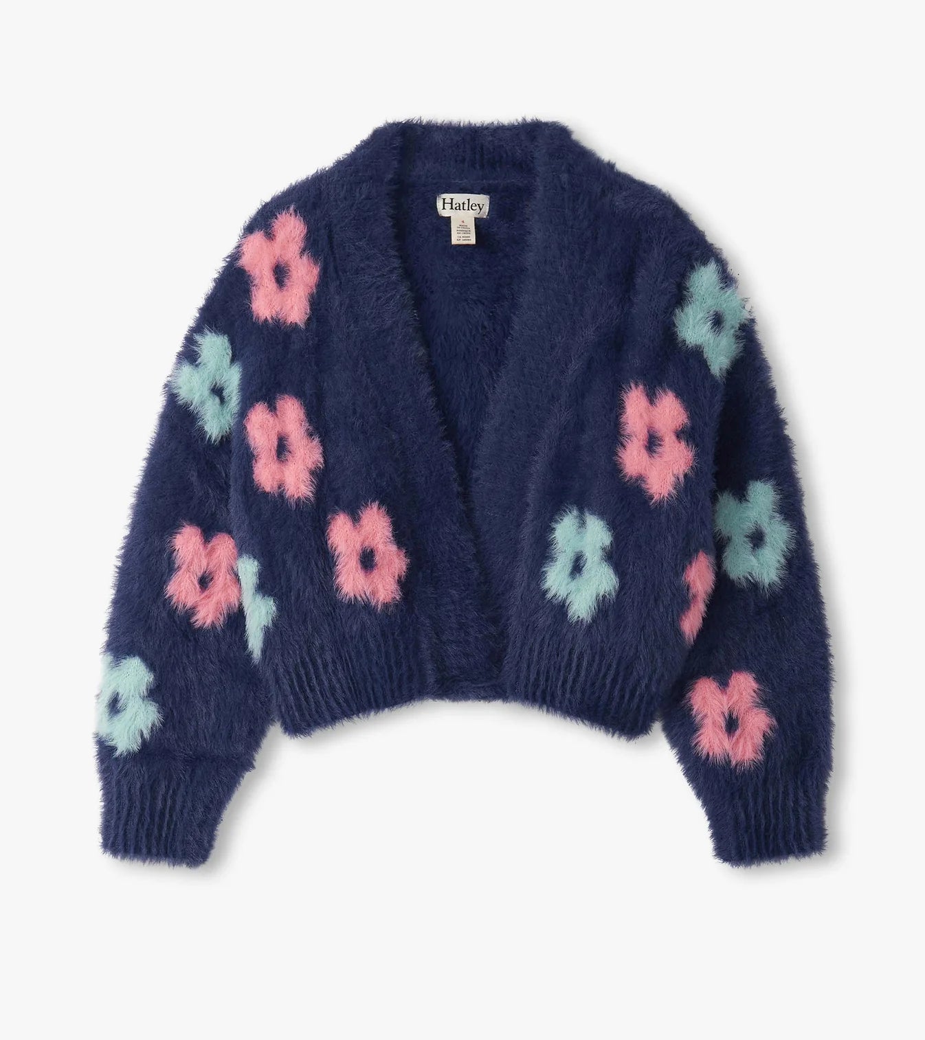 Cozy and playful, the Girls Big Flowers Open Cardigan is crafted from ultra-soft extra fuzzy yarn for warmth with a touch of whimsy. Designed in a deep navy blue, this cropped cardigan features an open-front style with no buttons, making it easy to layer over her favourite tops. Dropped shoulders and ribbed trims at the front opening, cuffs, hem, and back neck add a polished finish, while the long sleeves keep it cozy for cooler days. The standout detail, large, fuzzy flower motifs in soft pink and mint green with navy centers, brings a bold, cheerful pop to her look.