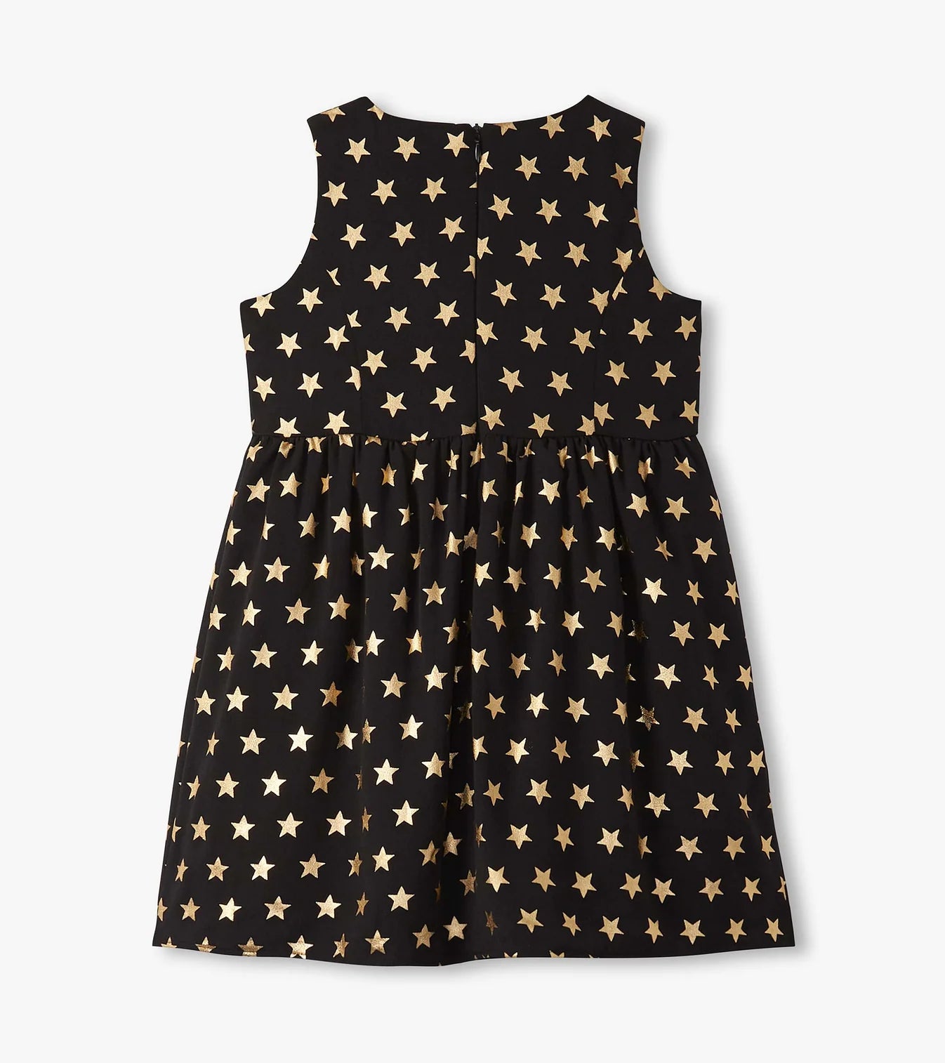 The Girls Gold Stars Princess Dress is a sparkling showstopper, crafted with a black crepe shell and cotton cambric lining for comfort and structure. Designed in a sleeveless A-line cut, it features a fitted bodice with front and back princess seams, a back zipper closure, and a gently gathered waist that flows into a flared skirt. Layers of tulle tucked between the shell and lining add volume and twirl-worthy charm, while an all-over gold metallic star pattern creates a magical, night-sky effect.