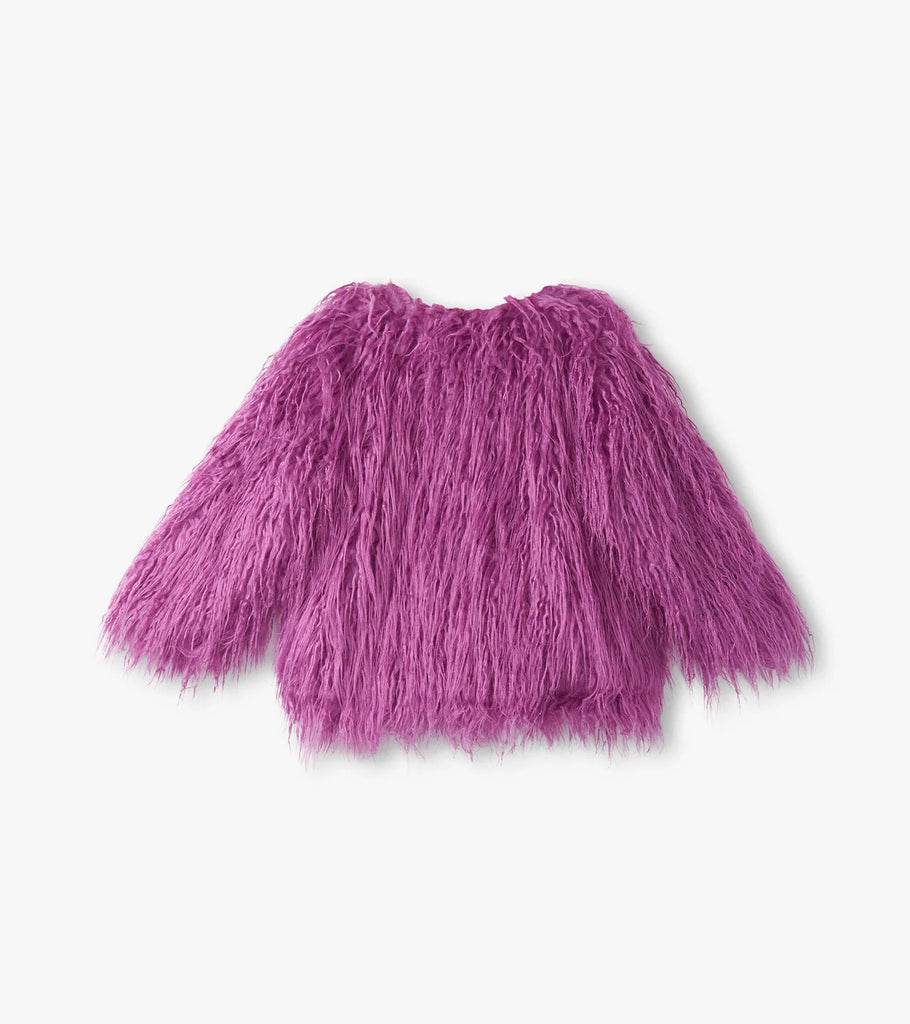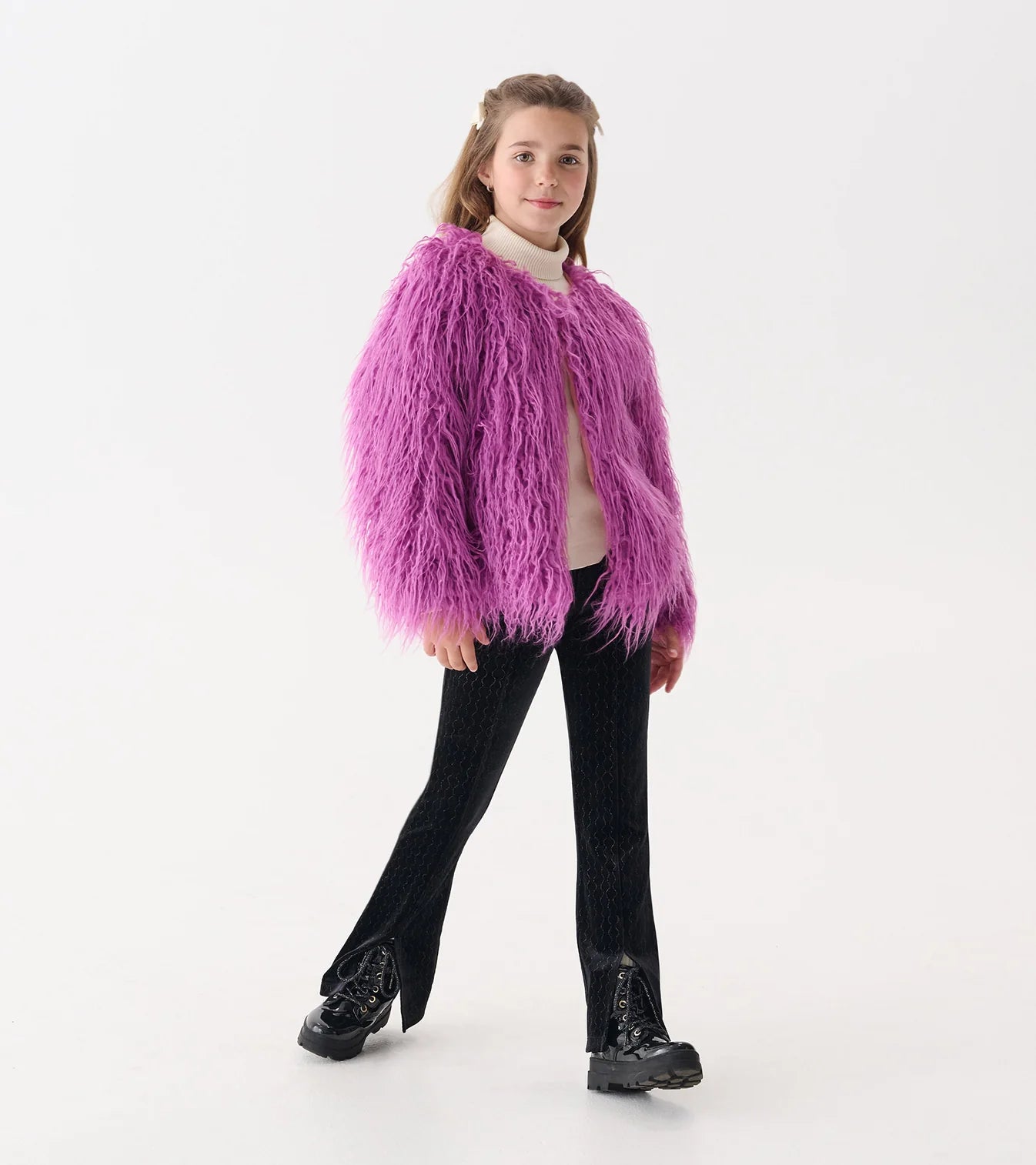 Add bold texture and colour to her cold-weather wardrobe with the Girls Radiant Orchid Mongolian Faux Fur Topper, a statement piece designed for warmth and style. Made with long-pile faux fur in a vibrant magenta-purple shade, this fully lined topper feels as luxe as it looks. Featuring long sleeves, an open-front silhouette, and three discreet hook-and-eye closures at the center front, it offers both versatility and comfort. A satin lining ensures a smooth fit, while a hanger loop at the back neck adds convenience.