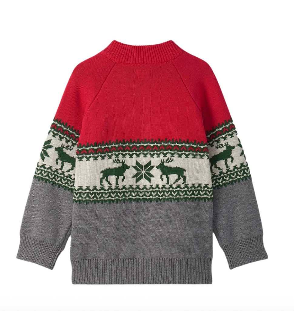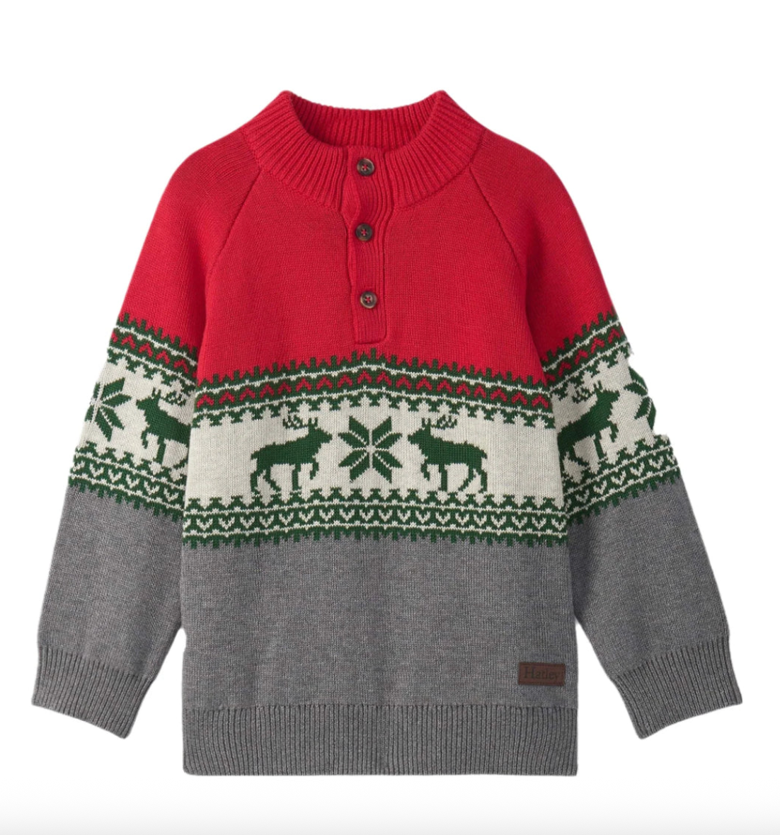 A perfect pick for the holiday season, this cotton sweater from Hatley features a bold elk and snowflake pattern in classic red, green, and grey. Soft and warm with a stylish mock neck and button detail.