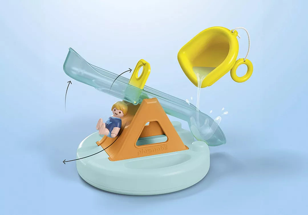 Great bathtub play fun with the floating Water Seesaw with Boat! By targeted pouring of water on the red dot the water slide tilts, so that figure and animal can slide (two different slide options). With cute baby octopus and boat to dock. Dimensions: 21 x 17 x 13 cm (LxDxH).