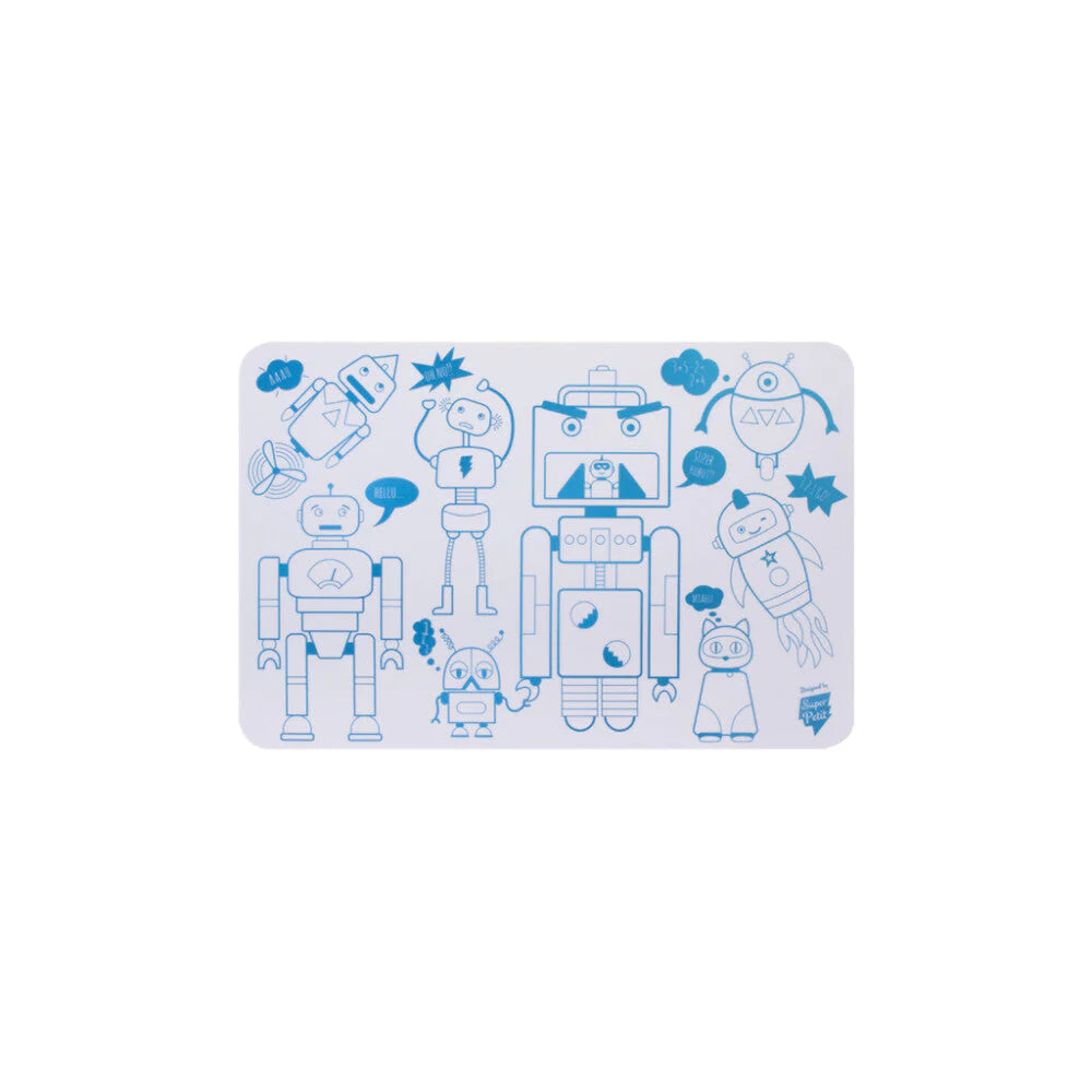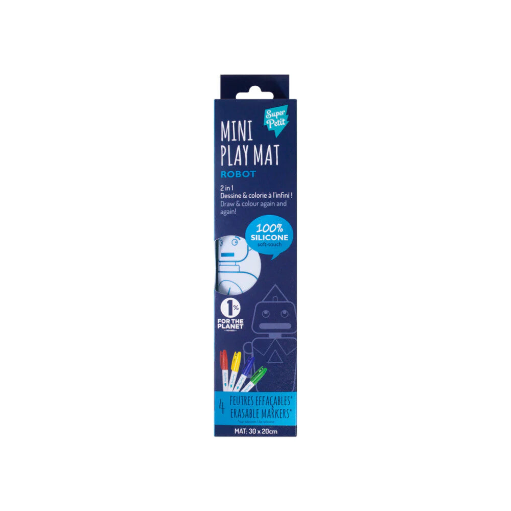 Super Petit Mini Playmat: ROBOT 1,2x2x9 in, reversible silicone drawing mat with 4 markers, in cardboard box, 3+
