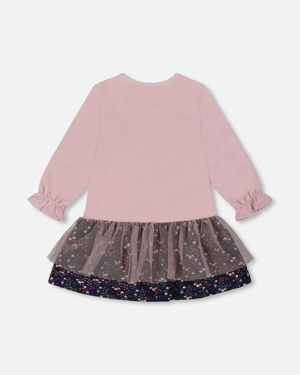 The Bi-Material Dress Dusty Pink is a whimsical mix of soft organic cotton and a playful, flowy skirt. This charming frock, made from organic cotton interlock on the top, fits comfortably, while the skirt features a mesh layer on top of a soft jersey fabric, creating a beautiful layered effect. The round neckline, two adorable printed cats, and puffed sleeves add extra charm and sweetness. With its relaxed fit, this dress is perfect for days filled with imagination, fun, and endless adventures.