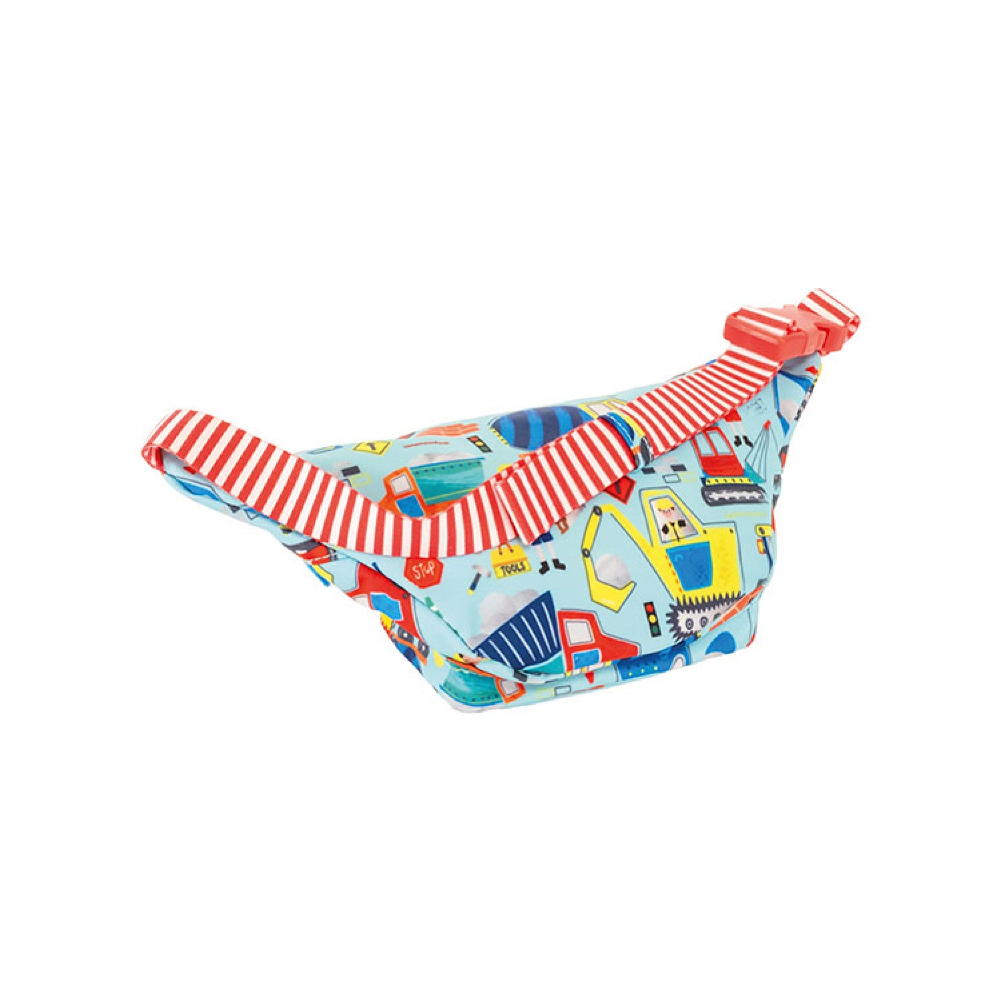 However you choose to style it (across your waist or over your shoulder) this belt bag is perfect for stylish adventurers who want to keep their most precious belongings close by for safe keeping! This belt bag has two chunky, digger shaped zip pulls, two handy compartments and an adjustable strap in a striped material. Inside the bag is a fun construction print and an ‘I belong to…’ label for personalization. Wipe clean. Eco-friendly.