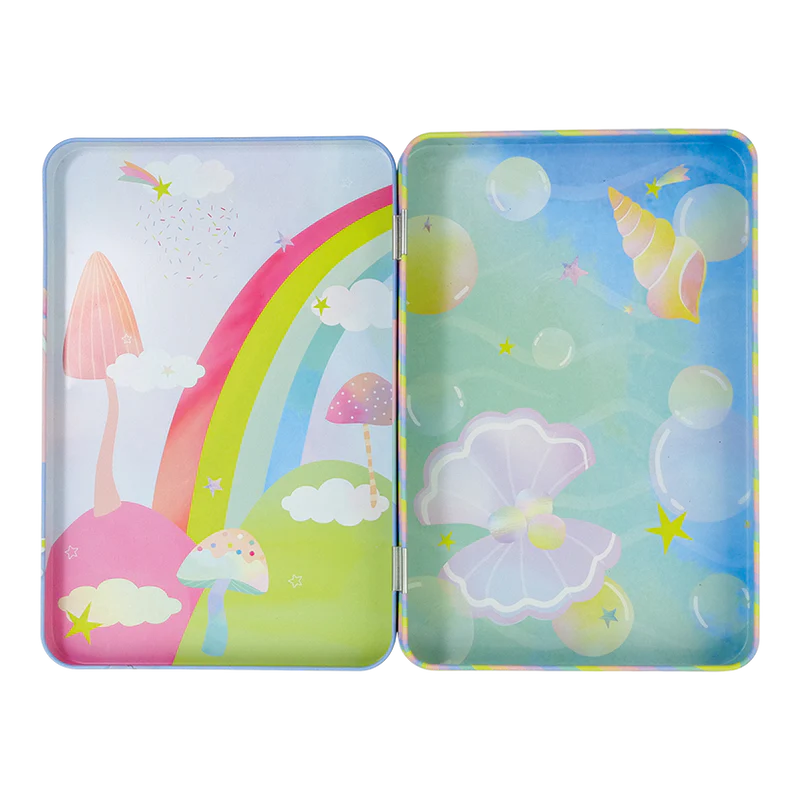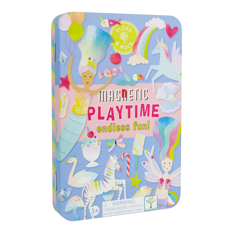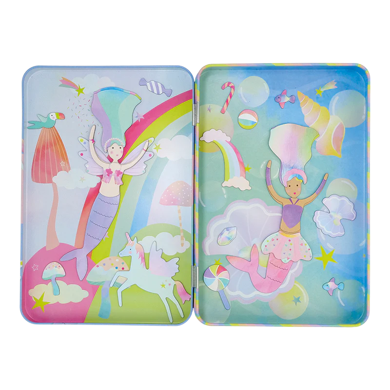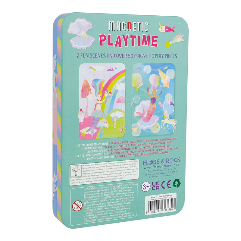 Playtime fun in a handy magnetic tin! Contains 3 sheets of pop out magnets so you can have fun sticking over 50 bright, fun magnetic pieces to the 2 fun scenes on the inside of your tin and let your imagination run wild creating fabulous pictures with mermaids, unicorns, friendly fish and much more. A perfect pick up gift, printed with soy inks and made using recycled materials. When you're finished playing, the magnetic tin safely stores all your pieces ready for next time.
