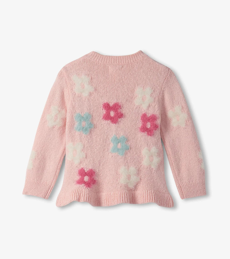 Wrap your little one in cozy charm with the Baby & Toddler Girls English Rose Flowers Pretty Sweater in Pink! Made from a soft cotton blend, this drapey pullover sweater is both comfortable and stylish. It features a delicate round neckline, long sleeves with cuffed wrists, and a slightly dropped shoulder for a relaxed fit. The light pink base is adorned with an all-over pattern of fuzzy white, pink, and baby blue flowers, while a full cardigan stitch ruffle at the hem adds a touch of playful elegance, perfect for chilly days and picture-perfect moments.