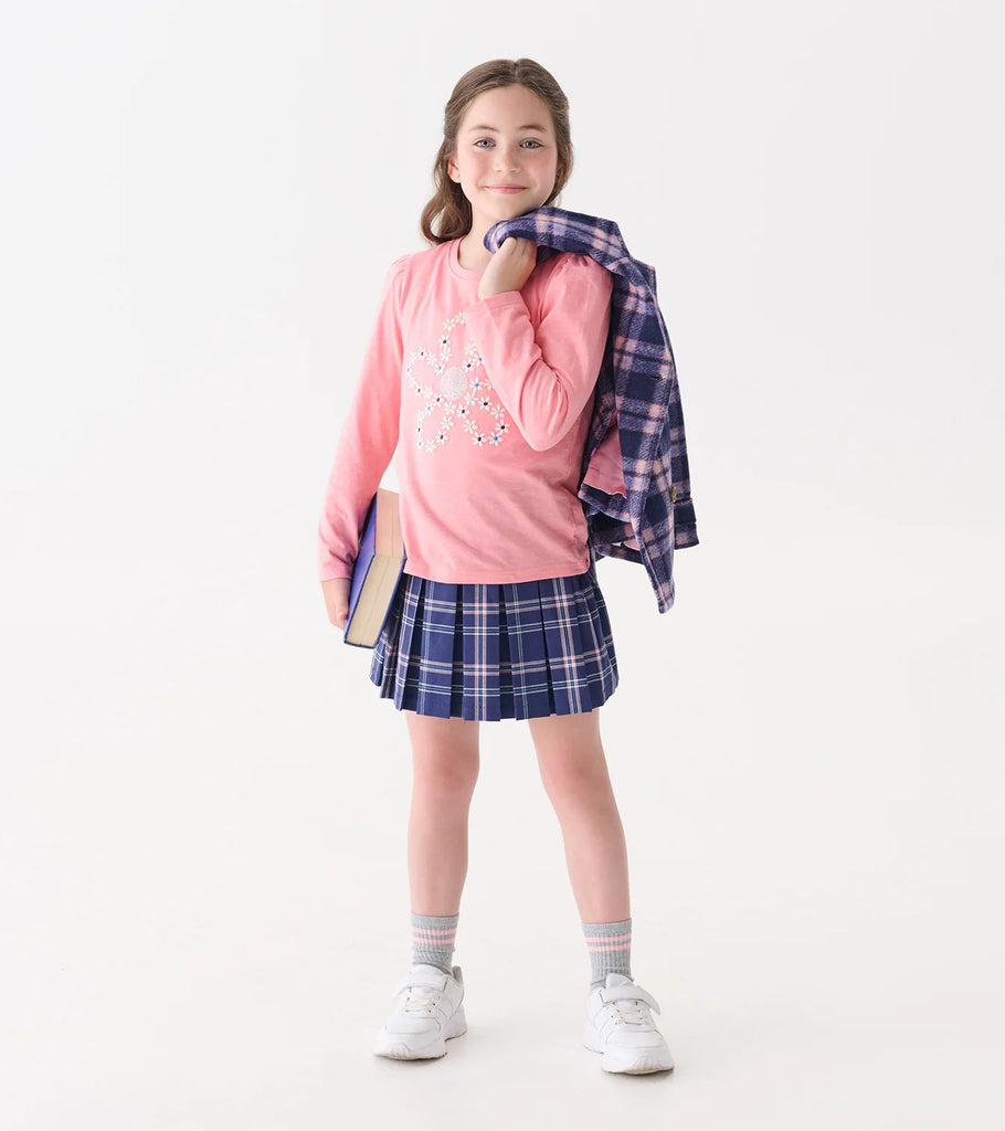 The Girls Preppy Plaid Pea Coat brings timeless sophistication with a playful twist, crafted from cozy faux woolly knit and fully lined in soft pink satin for comfort. Featuring a navy base patterned with soft pink plaid checks, this coat offers a polished double-breasted front with two rows of brown buttons and a classic notch collar. Long sleeves with button-tab details and front welt pockets add both style and function.
