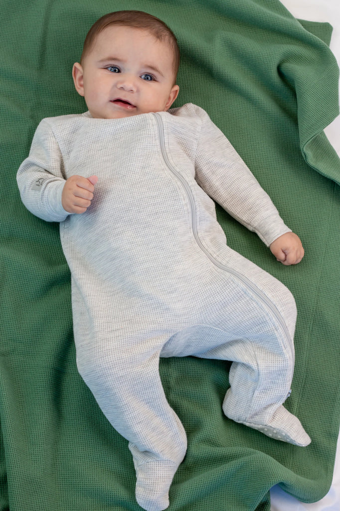 Our beautifully textured mini waffle knit sleeper offers ultimate cozy comfort for sleep and a fresh, modern look for daytime play. A brushed finish adds extra softness while a double zipper provides easy access for diaper changes.