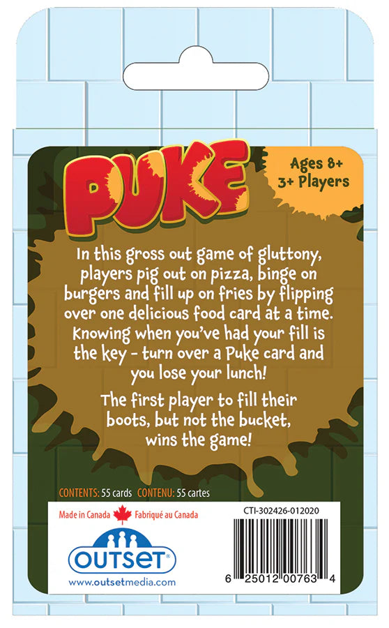Puke is the gross out game of gluttony! Players pig out on pizza, binge on burgers and fill up on fries by flipping over one delicious food card at a time. Knowing when you've had your fill is the key - turn over a puke card and lose your lunch. The first player to fill their boots, but not the bucket, wins the game!!
